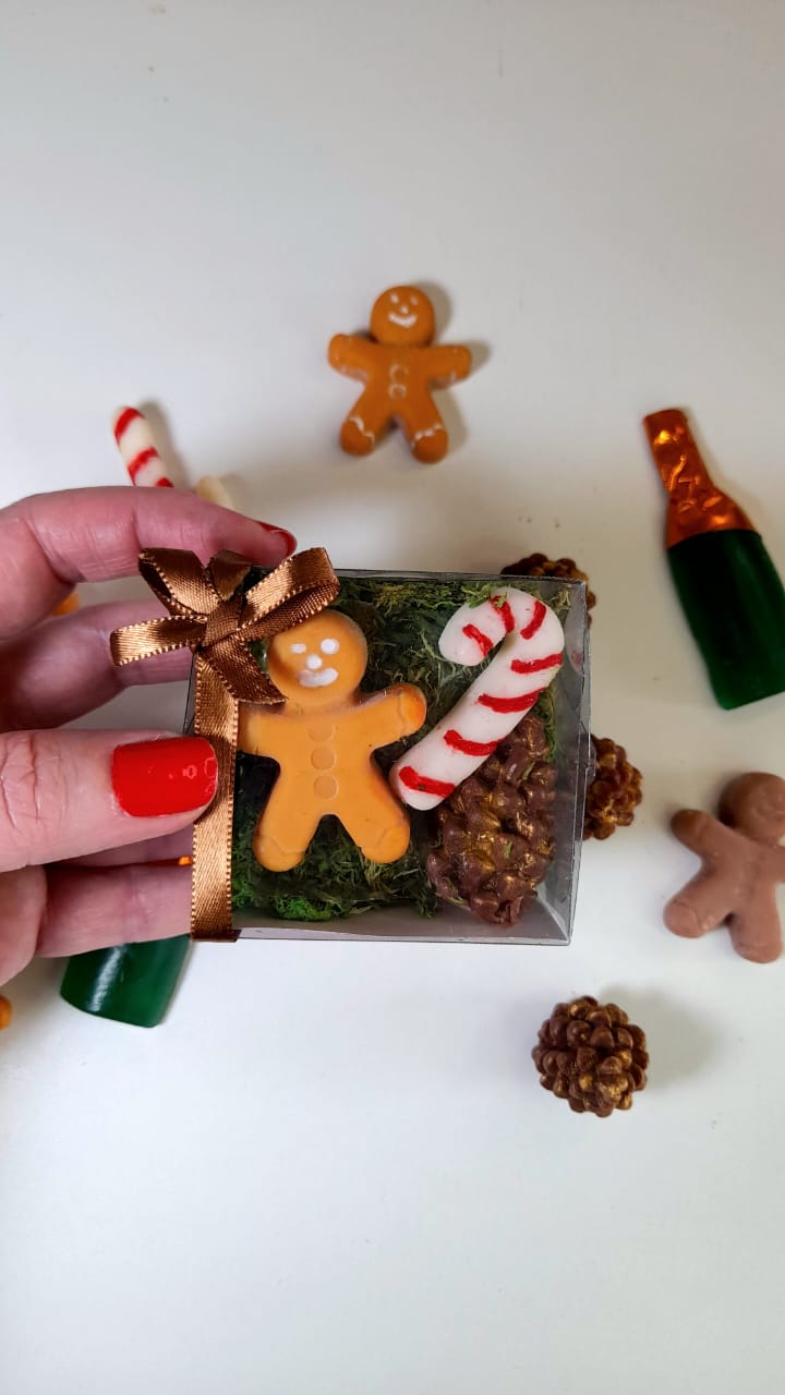 Acompanha 3 mini sabonetes, sendo eles: mini pinha, mini biscoito e mini bengala natalina com musgo verde, laço de cetim dourador ou podendo ser personalizado de acordo com o gosto do cliente!